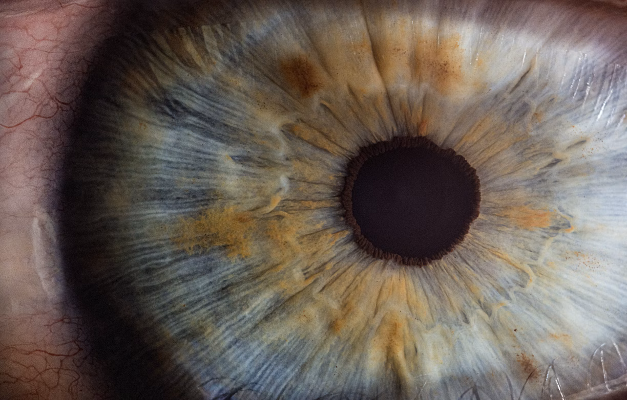 Die Iris (Regenbogenhaut): Das ist der farbige Teil des Auges. Die Iris funktioniert wie die Blende einer Kamera; sie öffnet und schliesst sich, um mehr oder weniger Licht durch die Pupille – das schwarze Loch in der Mitte der Iris – passieren zu lassen.